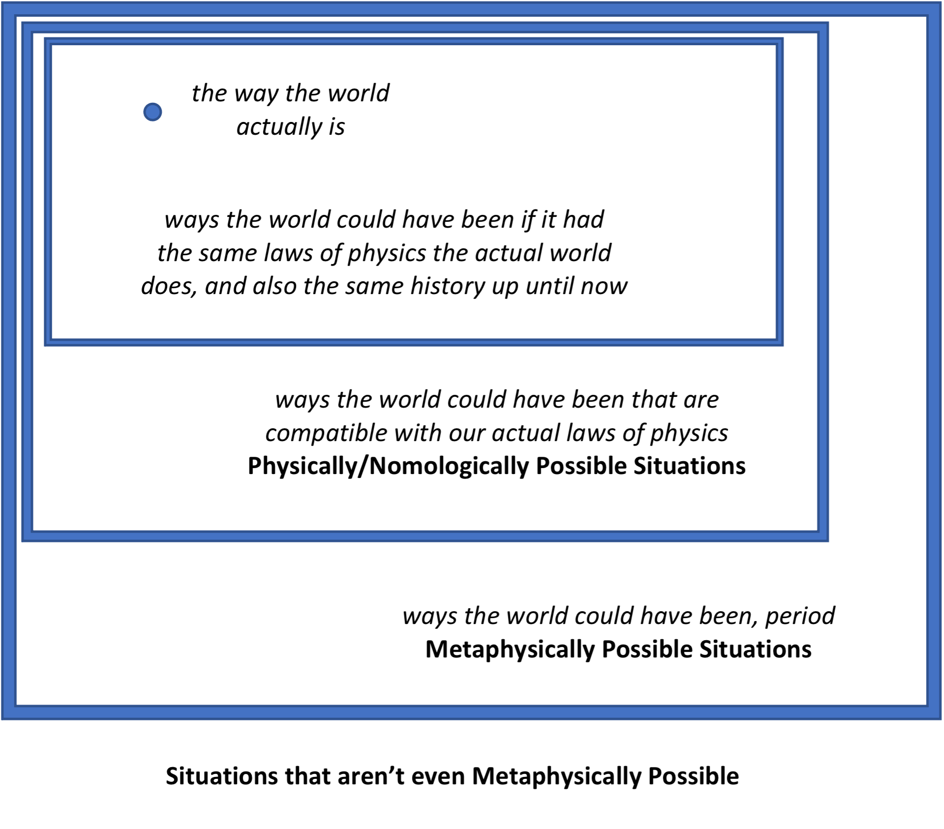 Many philosophers think things can be possible in a metaphysical sense, even if they’re contrary to our actual laws of physics, and so physically impossible. For example, the charge of an electron might have been larger; or the gravitational constants might have been slightly different. We know that, as things stand, the world is not that way. And if the world had been that way, then perhaps life as we know it would not have come about. But it still seems possible, in a broad sense, for the world to have been that way. Physicists sometimes talk about, and advance hypotheses about, what the world would be like if the laws of physics or the fundamental physical constants had been slightly different.
